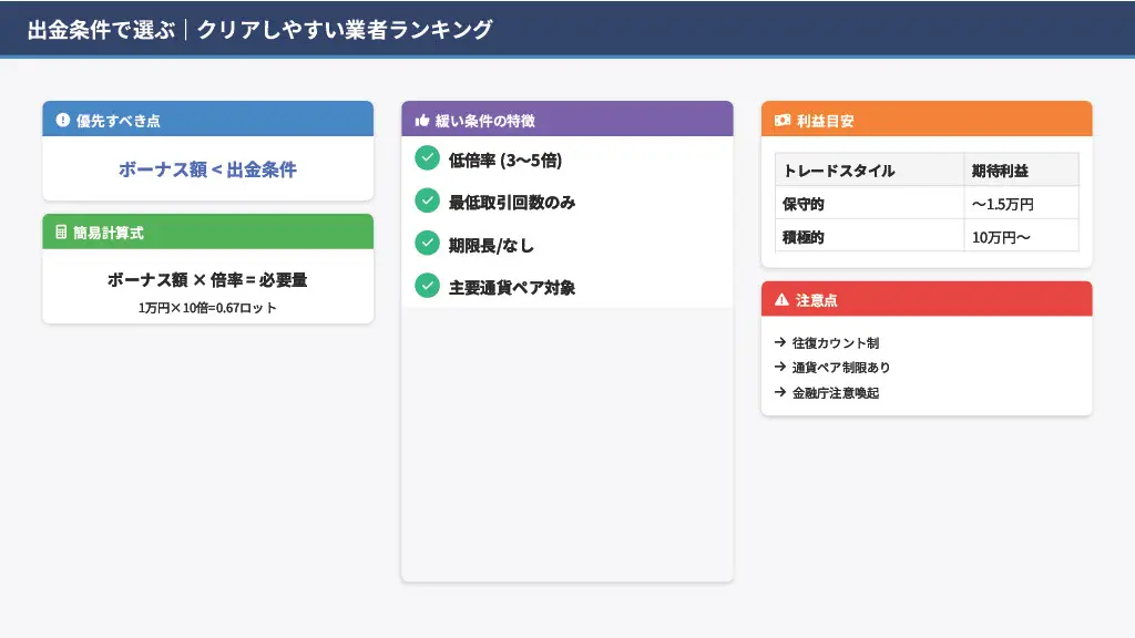 特に出金条件となるロット数の計算を事前に行い、現実的に達成可能か見極めてください。