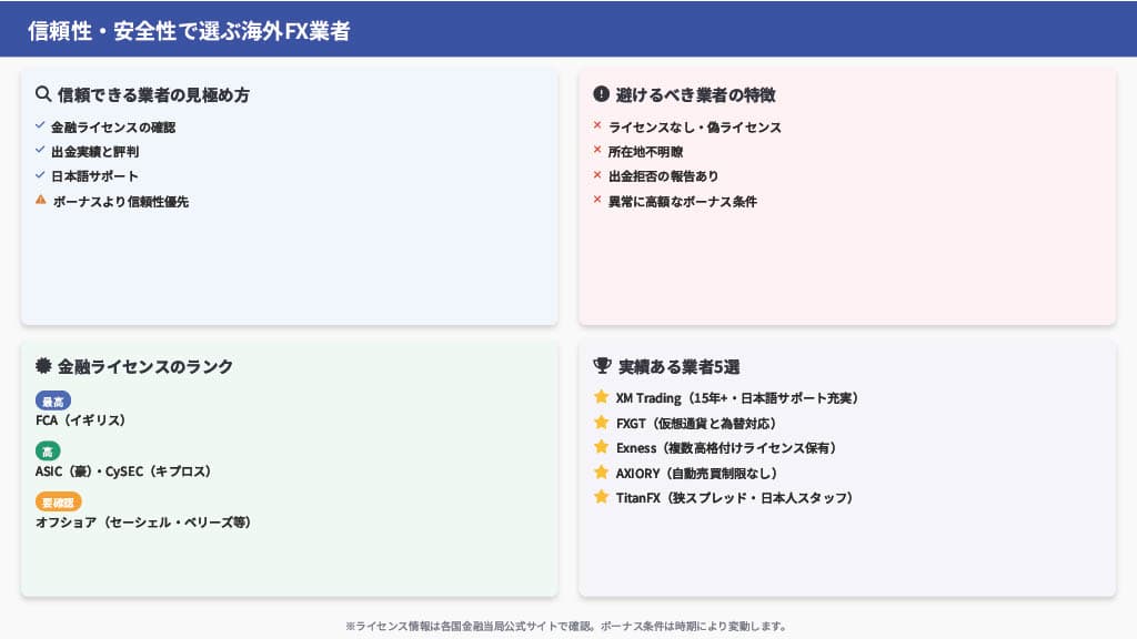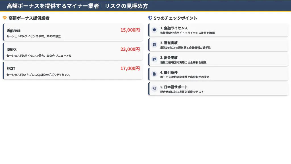 入金不要で取引できる口座開設ボーナスは魅力的ですが、安全性と実用性を兼ね備えた業者を見極める知識が不可欠です。