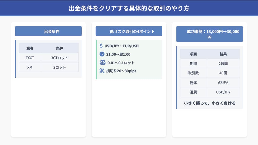 ボーナスだけで得た利益を確実に出金するための実践的なノウハウが身につき、「13,000円のボーナスを30,000円に増やして出金成功」といった成果も実現可能です。