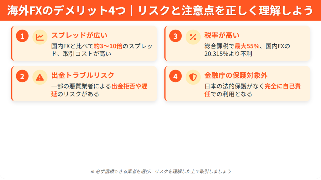 海外FXは税制面で不利になるケースがあり、出金トラブルや業者選定のリスクも存在するため、慎重な判断が必要です。