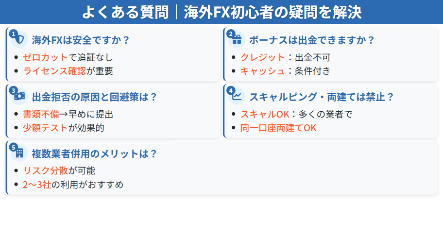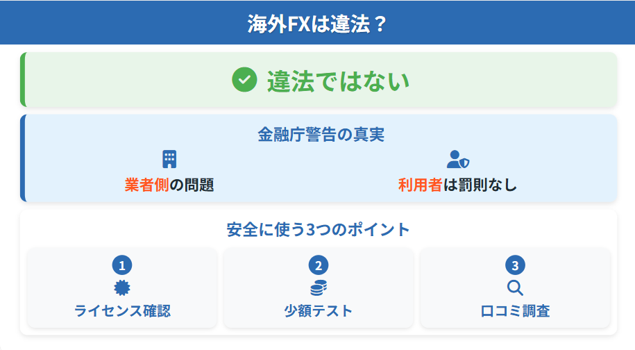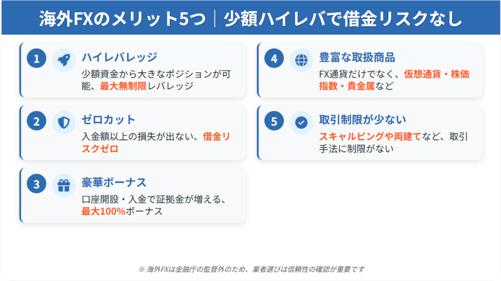 海外FXは高いリターンが期待できる一方、為替変動リスクや業者選定の重要性も理解した上で利用しましょう。