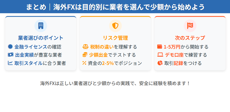 ここまで海外FXの基礎知識から業者選びのポイント、メリット・デメリット、始め方までを網羅的に解説してきました。