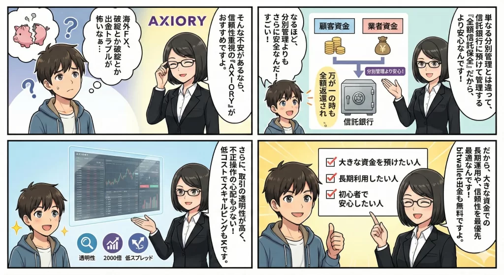 また、顧客資金は分別管理されており、万が一経営困難や倒産が起きた際でも顧客の資金が赤字の補填にされることなく安全に保管される体制。