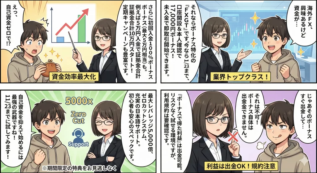 また、多くの海外FX業者は口座開設ボーナスや入金ボーナスなど豊富なキャンペーンを提供しています。