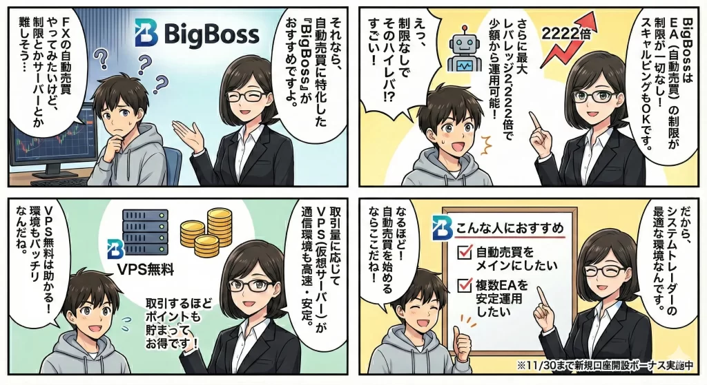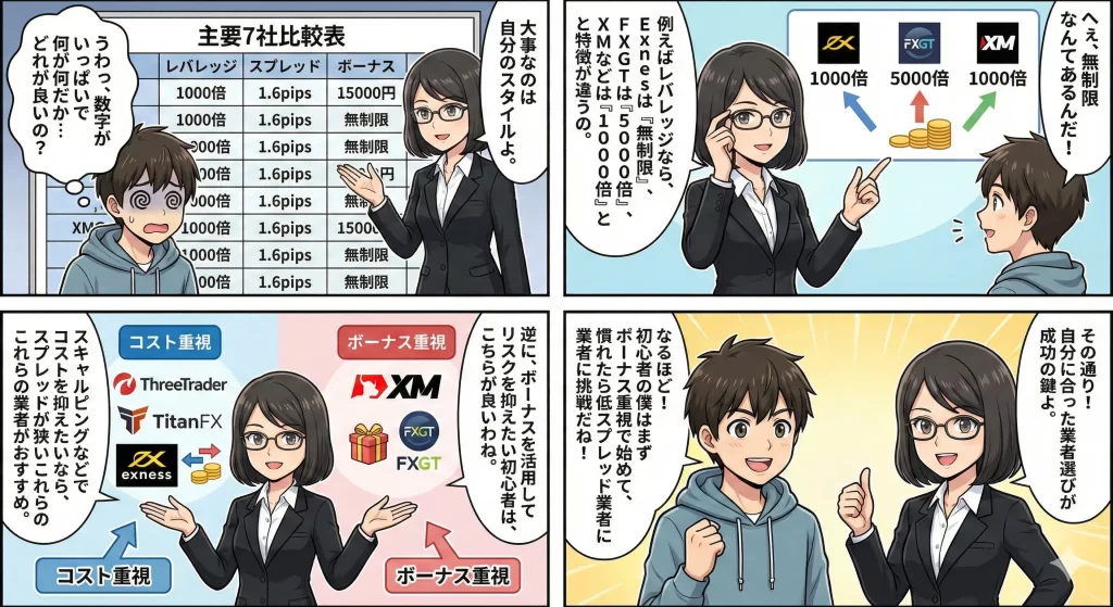 以下では、初心者向けの総合力が高い業者から、スキャルピング・信頼性・ハイレバレッジ・ボーナス・低コスト・自動売買という各目的に特化した業者まで、それぞれの強みと具体的なスペックを詳しく解説していきます。