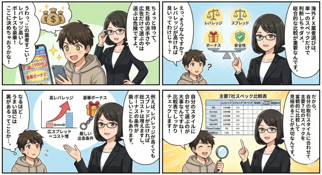 レバレッジやスプレッド、ボーナスだけで判断するのではなく、信頼性・取引コスト・サポート品質・出金実績など、多角的な視点での比較が不可欠です。