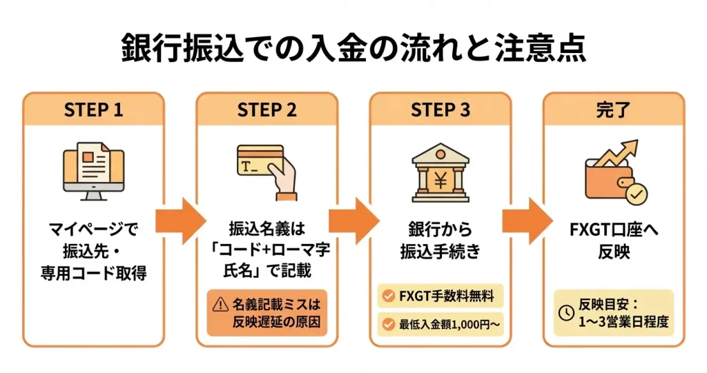 FXGTへの銀行振込入金は、通常即時〜数時間以内に反映されます。