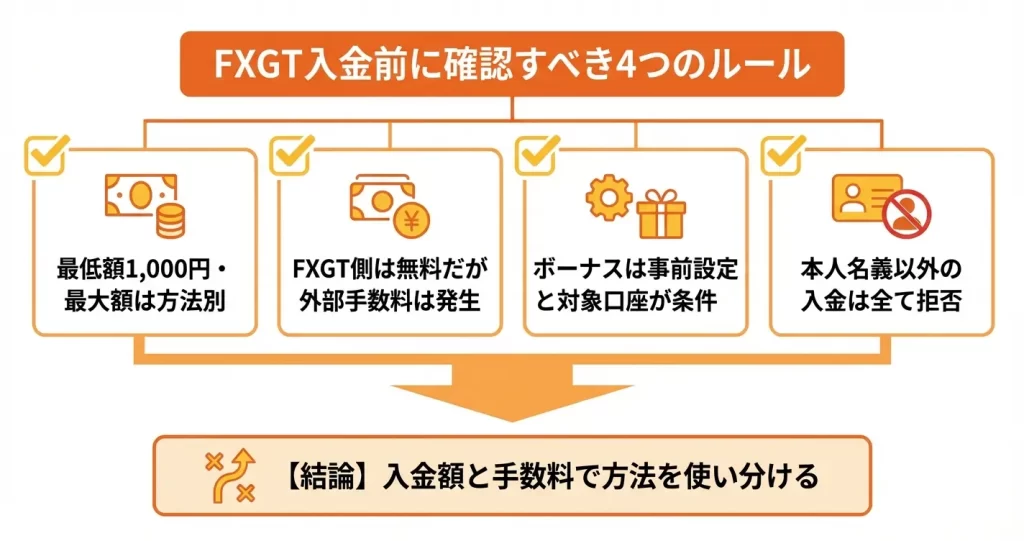 FXGTで入金を行う前に、知っておくべきルールと制限事項があります。