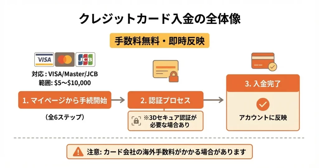 カード入金は即時反映されるため、すぐに取引を開始したい方に適した方法といえます。このセクションでは、カード入金の特徴や対応ブランド、具体的な入金手順を画像付きで解説します。