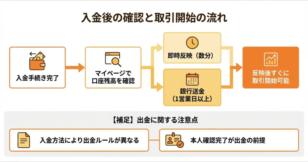 このセクションでは、入金反映をマイページで確認する手順と、取引開始のタイミング、入金後の出金ルールについて解説します。
