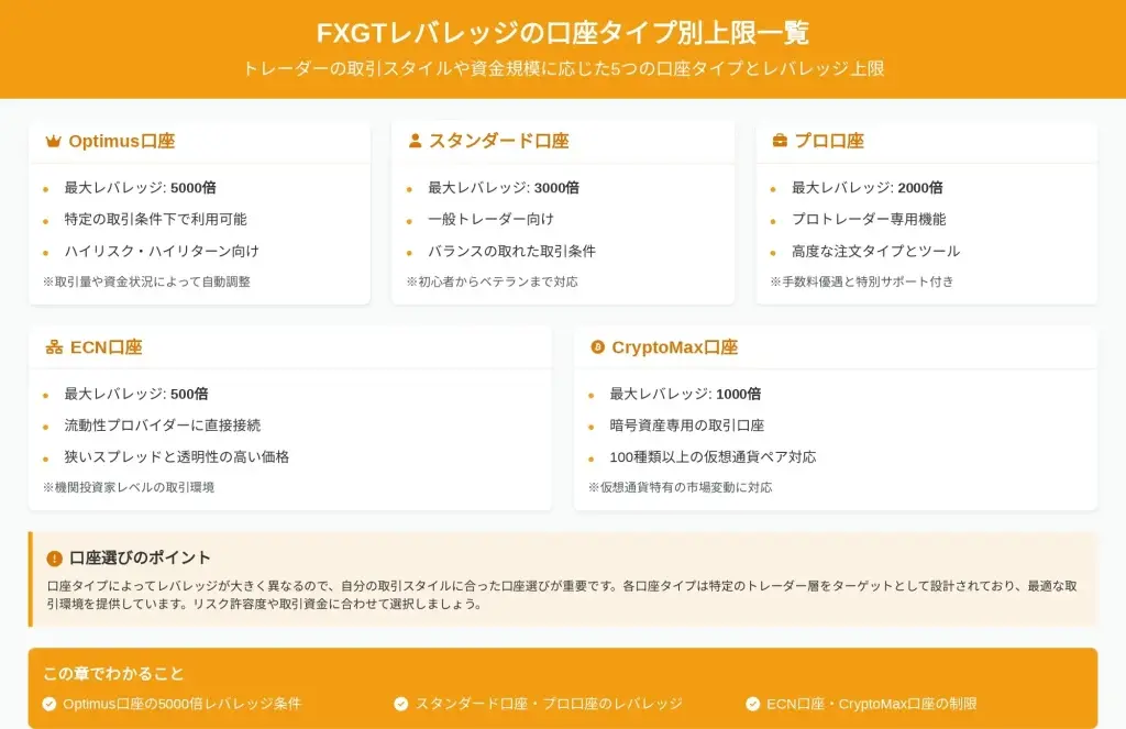 FXGTでは、トレーダーの取引スタイルや資金規模に応じて、5つの異なる口座タイプを提供しており、それぞれに異なるレバレッジ上限と取引条件が設定されています。