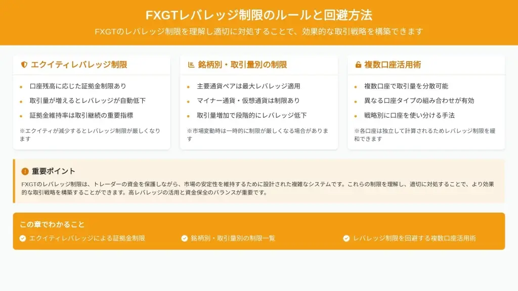 本記事では、FXGTのダイナミックレバレッジシステムの詳細から、口座タイプ別の上限一覧、エクイティレバレッジによる制限ルールと回避方法まで徹底解説します。