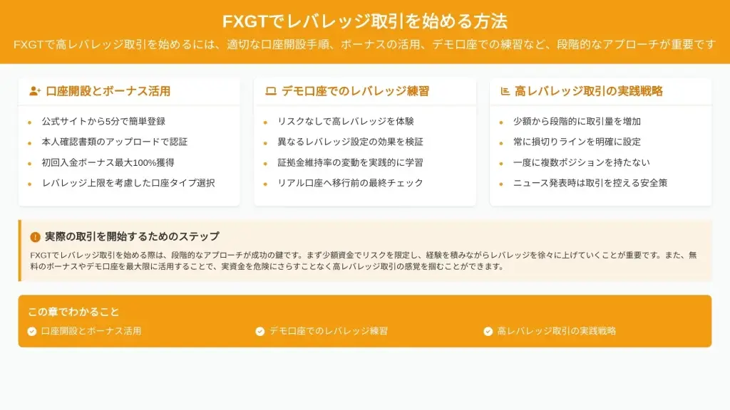 FXGTで高レバレッジ取引を始めるには、適切な口座開設手順、ボーナスの活用、デモ口座での練習など、段階的なアプローチが重要です。
