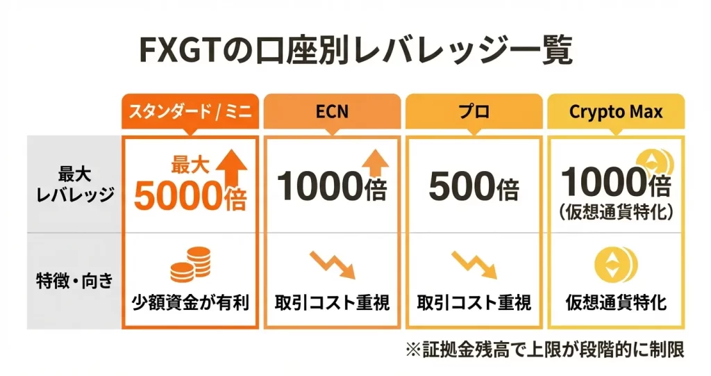 FXGTのレバレッジは最大5000倍|基本条件と対象口座