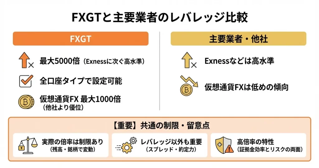 他社との比較では、XMやExnessといった主要海外FX業者も高レバレッジを提供していますが、FXGTは仮想通貨を含む銘柄の多様性と、最大5000倍という業界上位水準のレバレッジを両立している点が特徴とされています。
