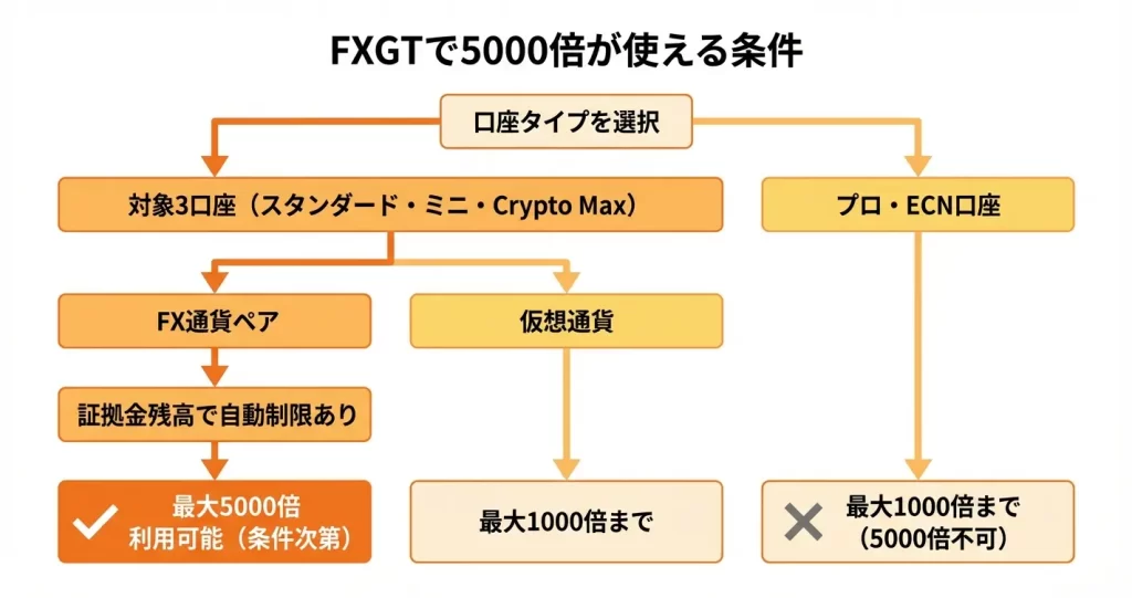 このセクションでは、5000倍レバレッジが使える口座タイプと、銘柄ごとの上限、取引を始めるために必要な条件を整理します。