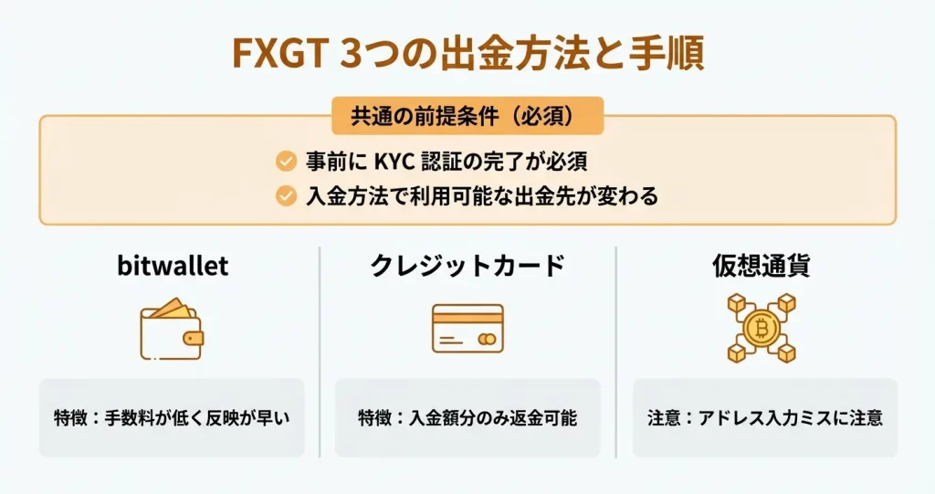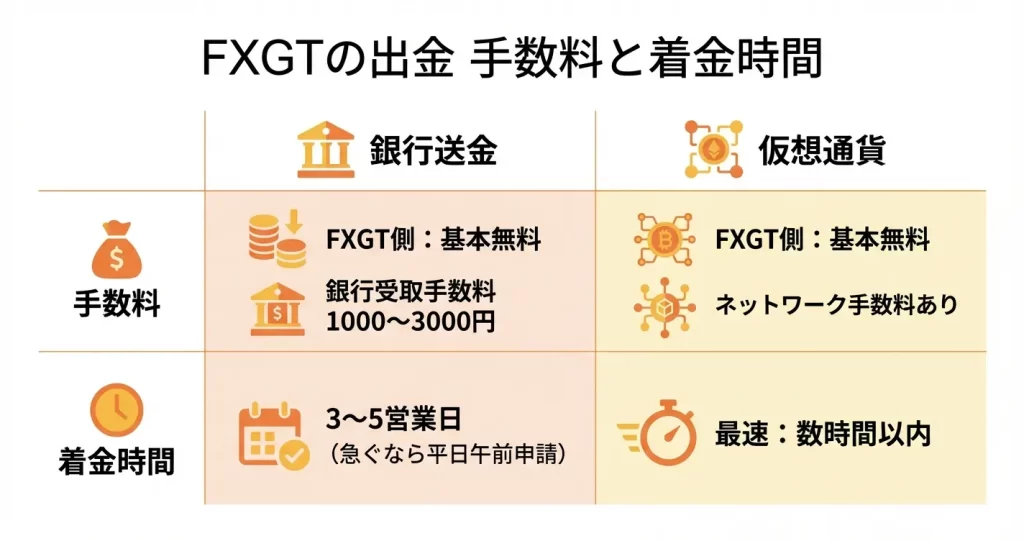 FXGTでは出金方法によって手数料体系が異なるため、自分の利用状況に合わせた選択が重要になります。