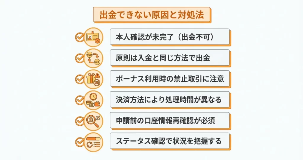 出金ができない場合、主に本人確認の未完了・取引条件の未達成・口座間の資金移動の制約が原因となります。
