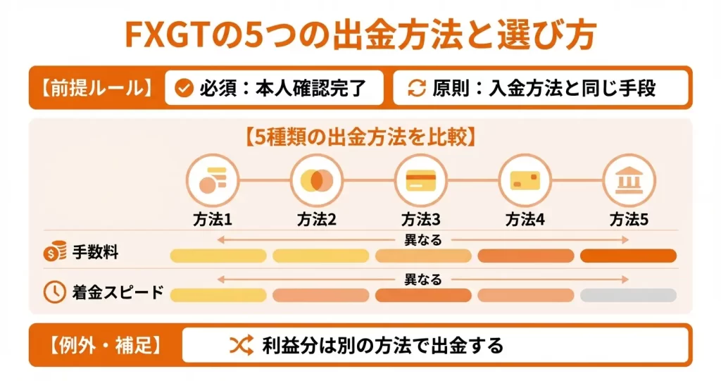 FXGTでは銀行送金、bitwallet、カード、仮想通貨、電子決済の5種類から出金方法を選べます。それぞれ手数料や着金スピード、利用できる条件が異なるため、自分の入金方法や出金希望額に応じて適切な方法を選ぶ必要があります。