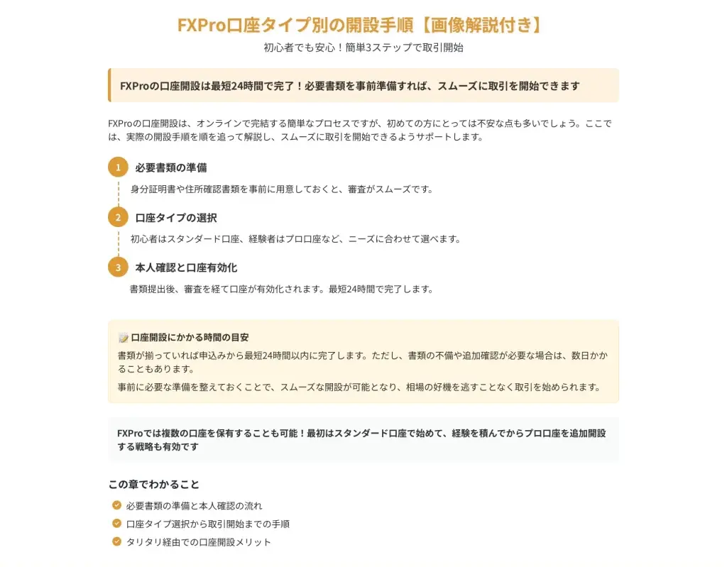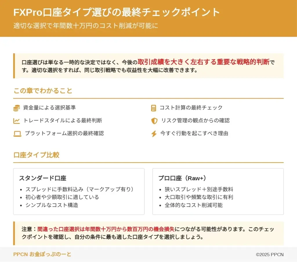 この記事を読めば、FXProの口座タイプ選びで迷うことなく、あなたの投資スタイルと資金規模に最も適した口座を自信を持って選択できるようになり、取引開始後も最適なコスト環境でトレードを行うことができるようになります。