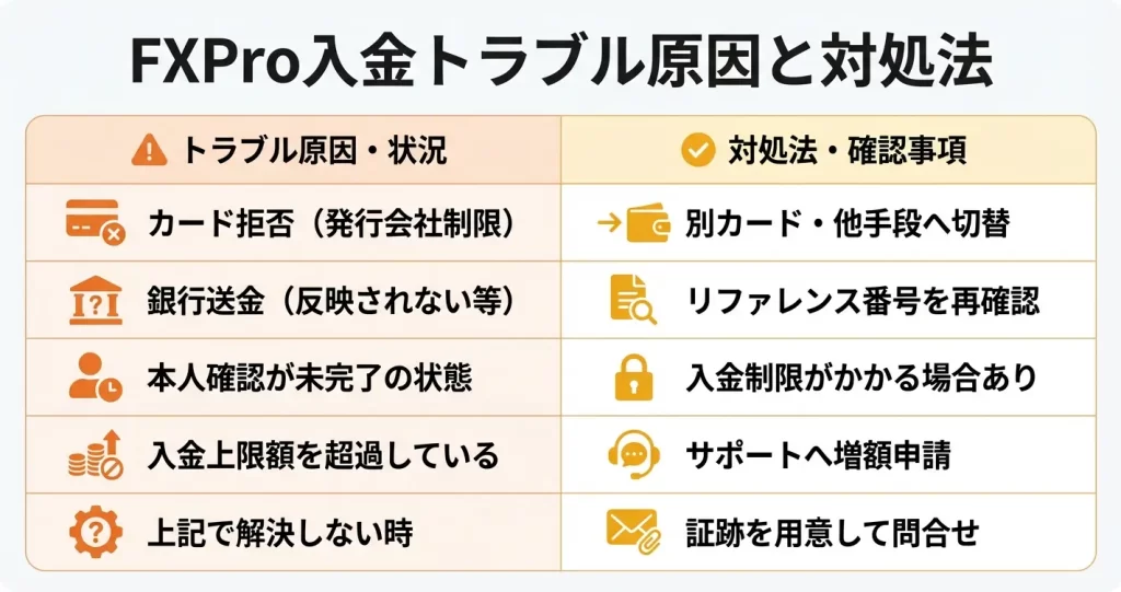反映が遅いと感じた場合は、まず入金元の決済完了状況を確認し、問題がなければFxProのサポートへ問い合わせることをおすすめします。