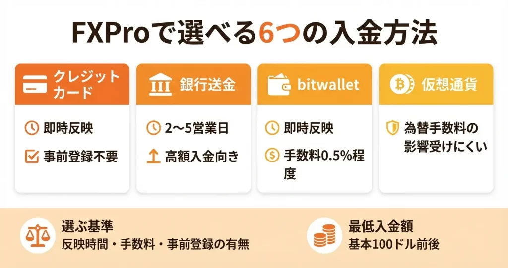 このセクションでは、FXProで利用可能な6つの入金方法の特徴を解説し、比較表で違いを明確にします。