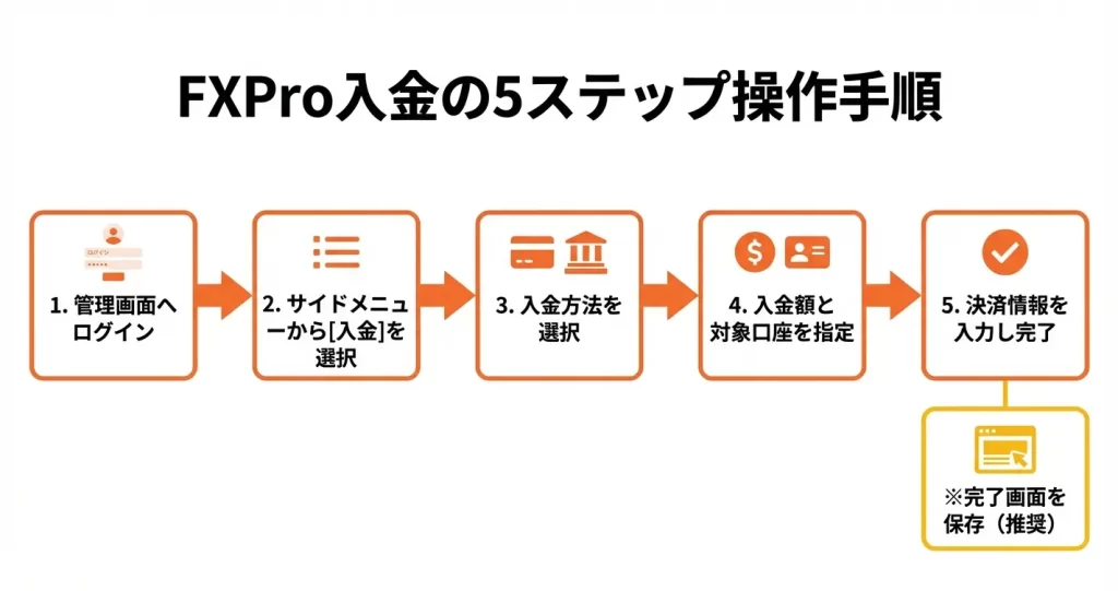 FXProへの入金は、管理画面から5つのステップで完了します。