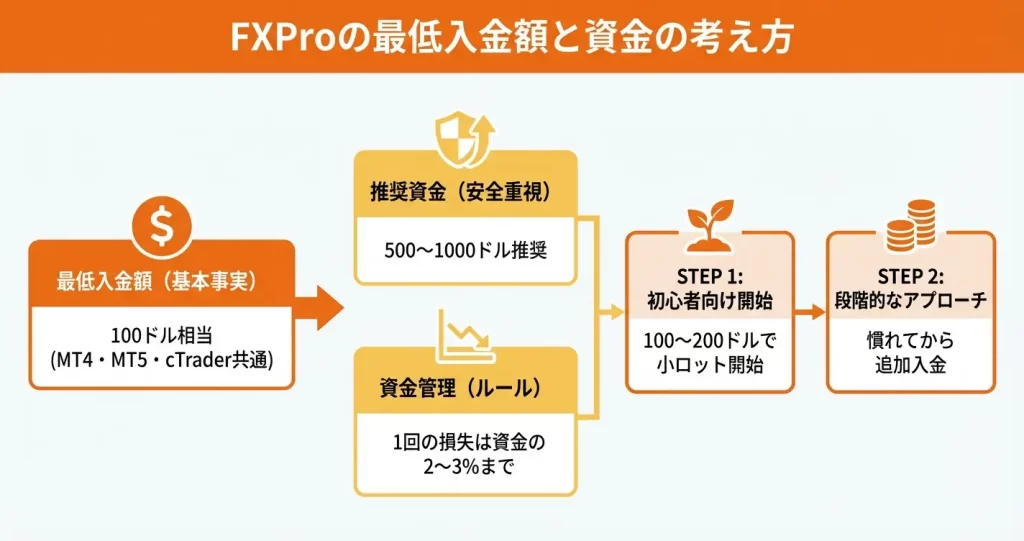 スタンダード口座では100ドル相当、一部の上級者向け口座ではより高額な設定となっていることがあるため、管理画面の入金ページで表示される金額を最終確認してください。