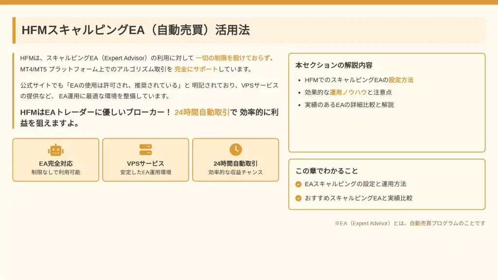 EA(自動売買)の活用は、感情を排除した機械的な取引を可能にし、24時間の市場機会を逃さないという大きなメリットがあります。