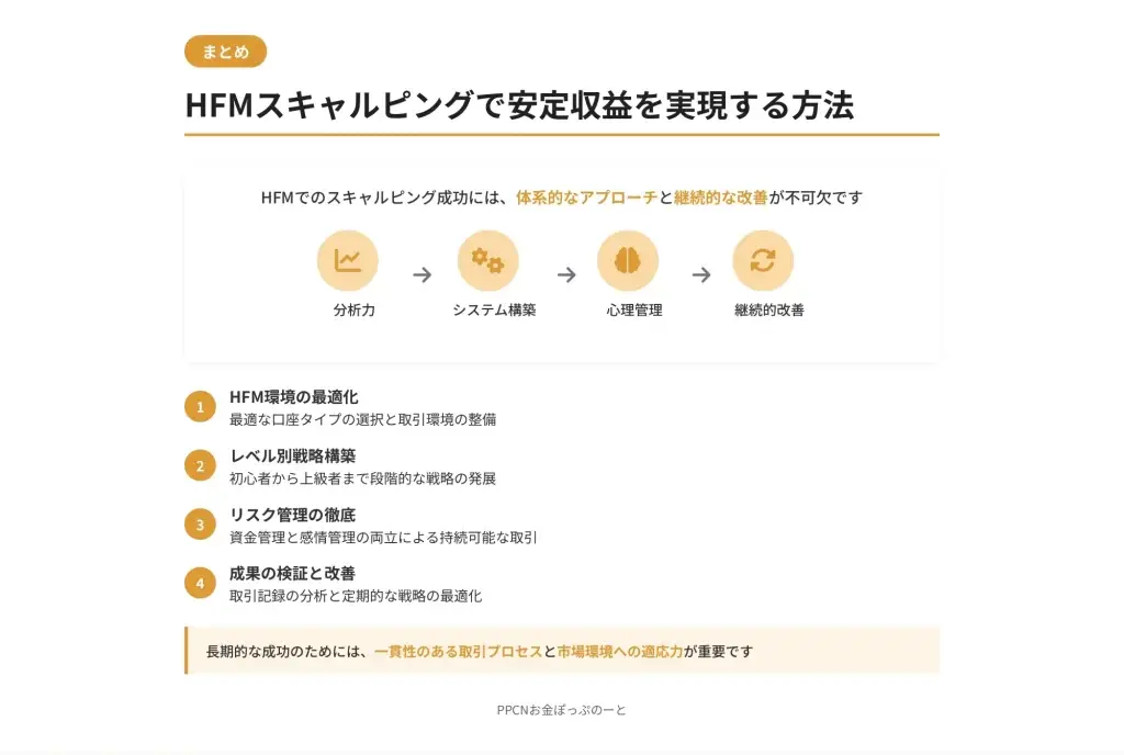 最終的に、HFMでのスキャルピング成功は、システマティックなアプローチと継続的な学習にかかっています。