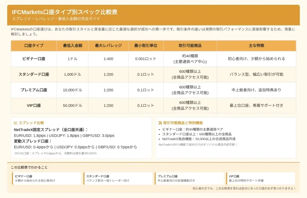 この記事では、IFCMarketsの3つの口座タイプの詳細なスペック比較から、取引スタイル別の最適な選び方、実際の取引コストシミュレーション、最新のボーナス・キャンペーン情報まで徹底解説します。
