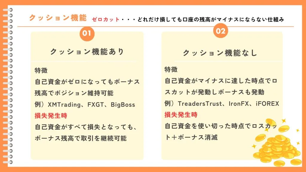 クッション機能とは、一言で言えば「ボーナスを証拠金として損失補填に使えるか」という仕組みです。