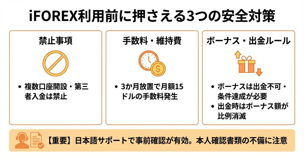 iFOREXを利用する前に、利用規約のうち特に禁止事項と口座管理に関する条項を確認しておくことが重要です。海外FX業者の規約は国内業者とは異なる部分が多く、知らずに違反すると口座凍結や出金拒否といった重大なトラブルにつながる可能性があります。