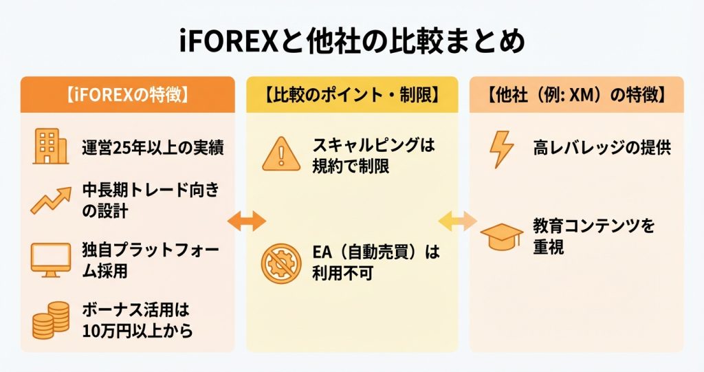 ここでは主要な海外FX業者との比較を通じて、iFOREXの特徴を整理し、どのようなトレードスタイルに向いているかを明確にします。業者選びの判断材料として活用してください。