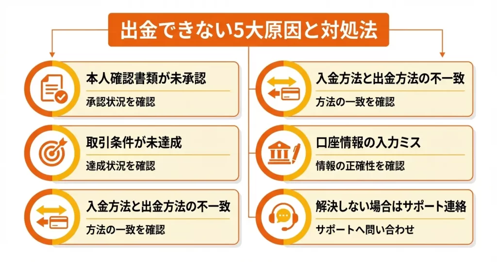 万が一出金が保留された場合は、書類の不備や複数口座の使用などが原因として考えられます。