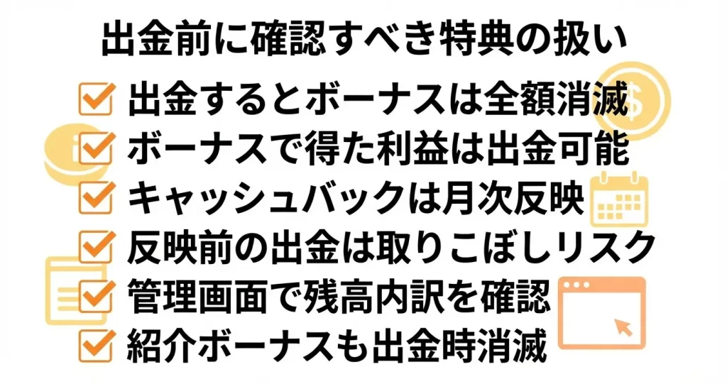 出金前にボーナスを活用した取引を完了させるか、ボーナスが消える点を理解した上で出金のタイミングを判断することが重要です。