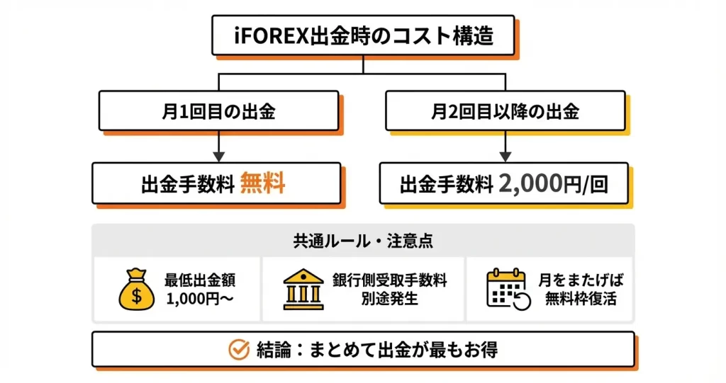 iFOREXでは、1か月あたり1回目の出金は手数料が無料ですが、同月内に2回目以降の出金を行う場合は1回につき2,000円の手数料が発生します。この手数料はiFOREX側が設定しているもので、出金方法による違いはありません。