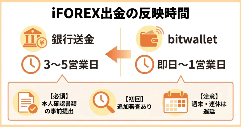次のセクションでは、iFOREXで利用できるそれぞれの出金方法での反映時間について詳しく解説します。