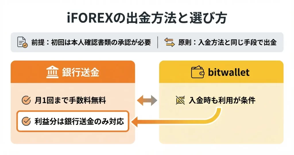 iFOREXでは、利用できる出金方法が大きく2種類に限定されています。