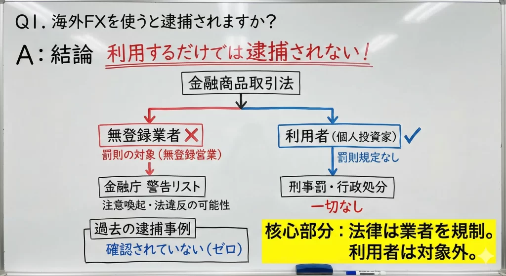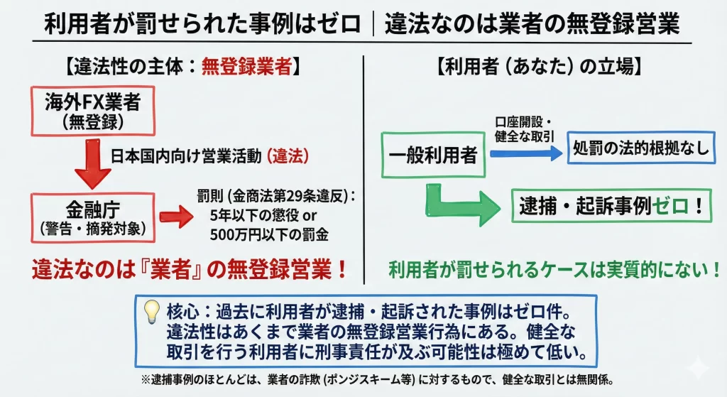 利用者が口座開設や取引を行う行為そのものを処罰する法的根拠は存在せず、実際に利用者が金融商品取引法違反で逮捕・起訴された事例は過去にゼロ件です。
