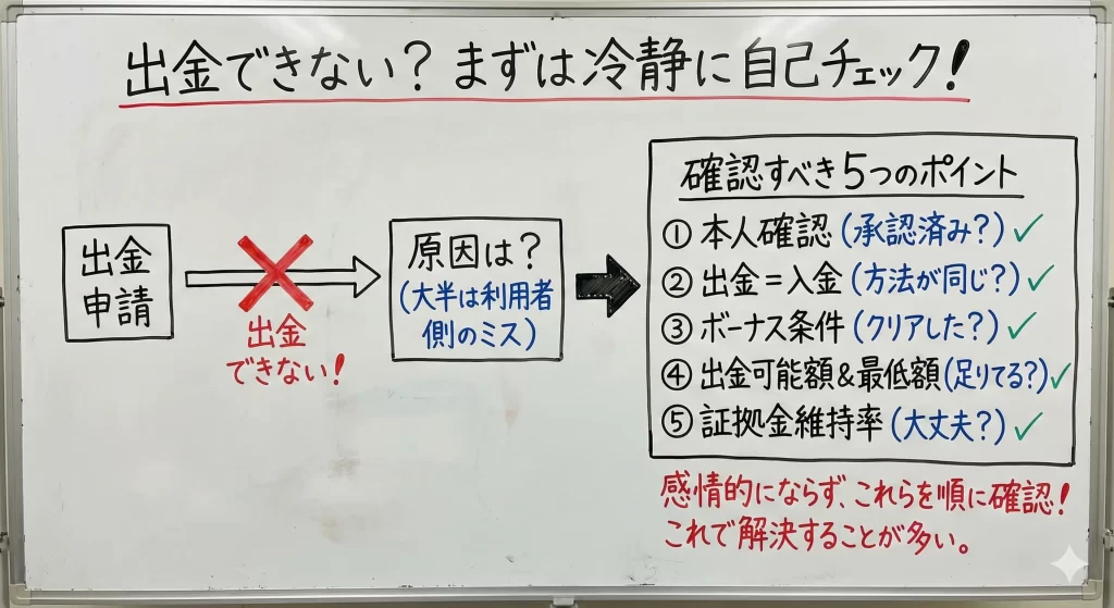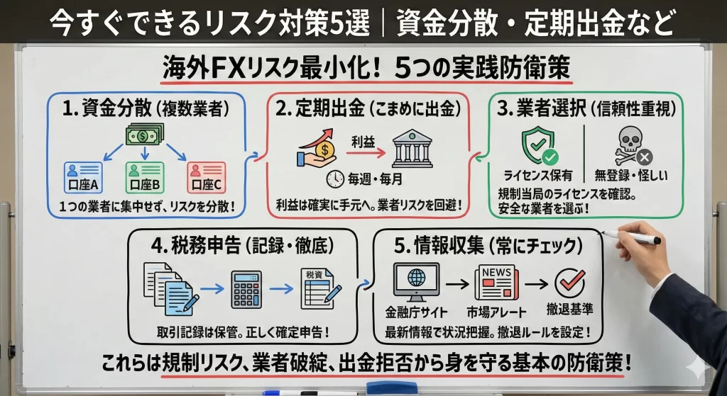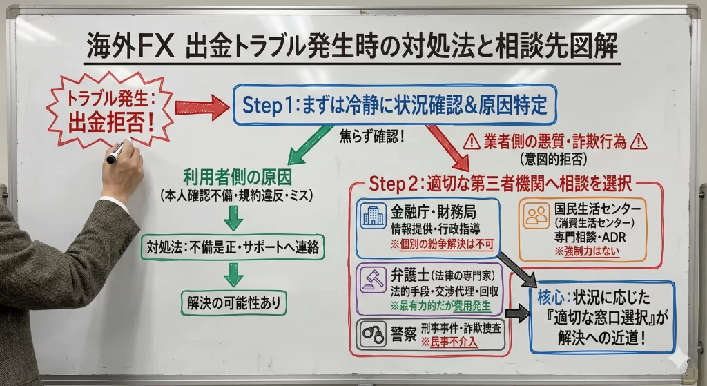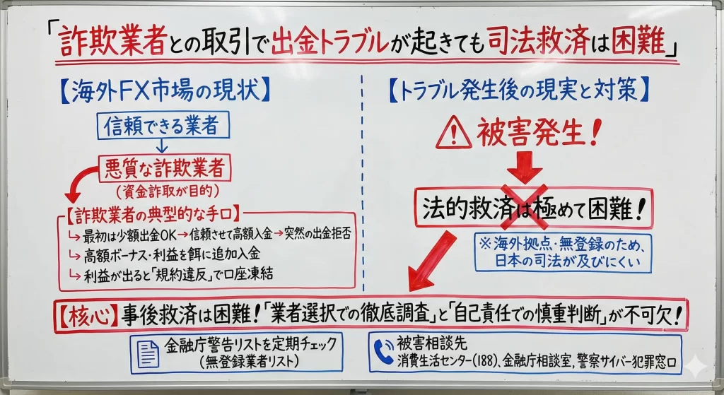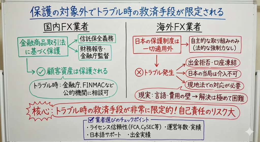 出金拒否や不当な口座凍結、取引条件の一方的な変更などが発生しても、日本の金融当局は介入できず、利用者自身が業者の所在国の法律に基づいて対応する必要があります。