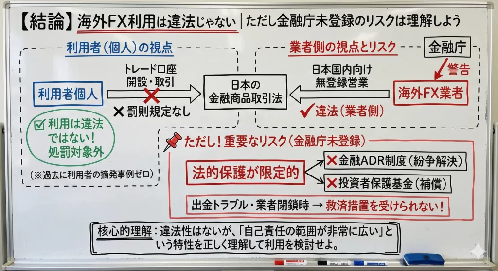 【結論】海外FX利用は違法じゃない|ただし金融庁未登録のリスクは理解しよう