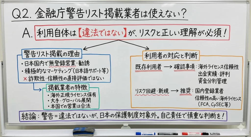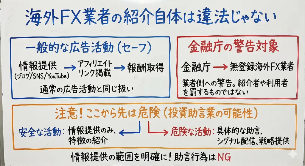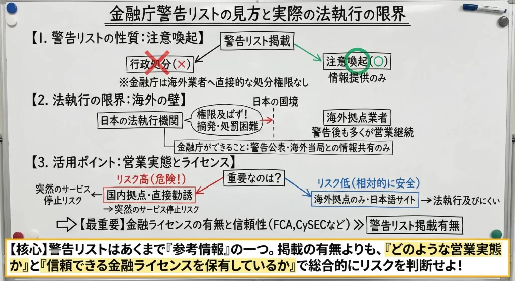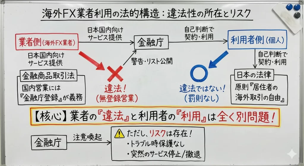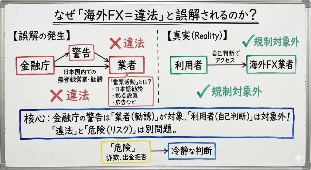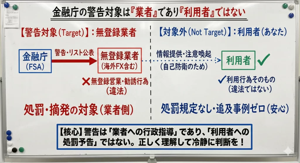 この誤解が生まれる最大の理由は、金融庁の警告対象が「業者」であって「利用者」ではないという点が正しく理解されていないためです。
