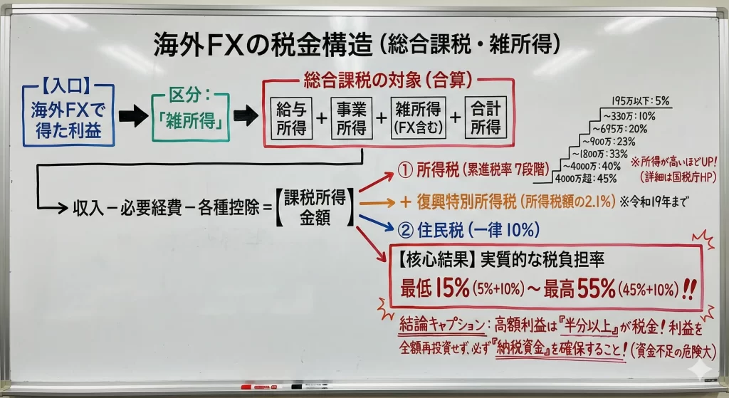 海外FXの利益は雑所得として総合課税の対象となり、税率は所得額に応じて15%〜55%(住民税含む)です。