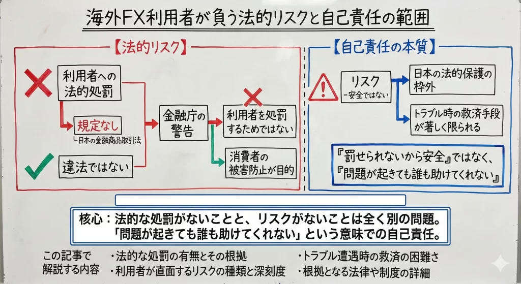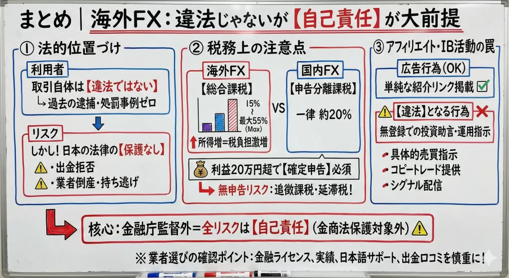出金拒否や詐欺被害に遭っても法的保護が受けられない、税金の申告を誤って重いペナルティを課される、悪質な業者に資金を失うなど、「違法かどうか」よりも「自己責任の範囲」を理解していないことが最大のリスクなのです。