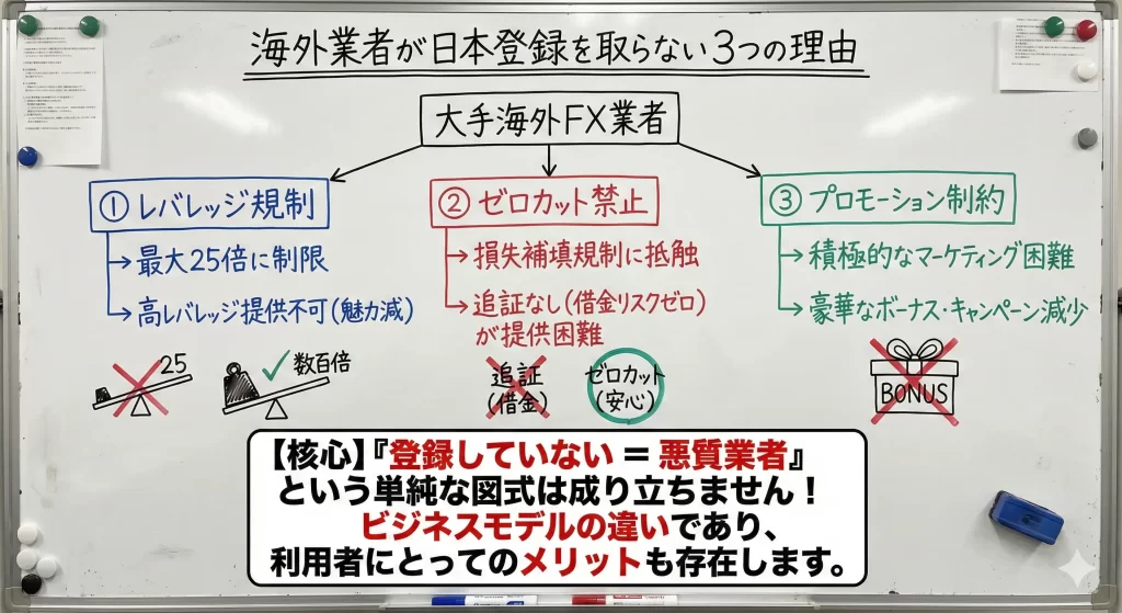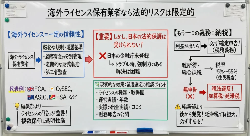 ただし、海外ライセンスを持っていても日本の金融庁登録がない限り、日本国内での法的保護は受けられません。