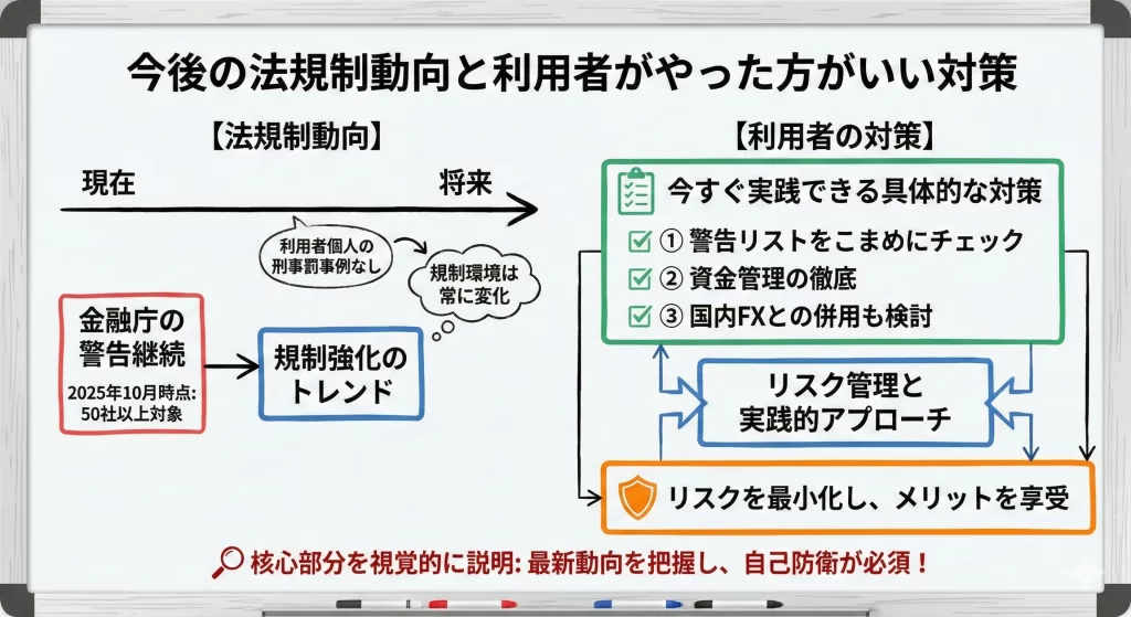 金融庁の警告文には「無登録業者との取引はリスクが高い」「トラブルが生じても法的救済が困難」といった注意喚起が含まれていますが、これは利用者を処罰する意図ではなく、あくまで「自己防衛のための情報提供」として位置づけられています。