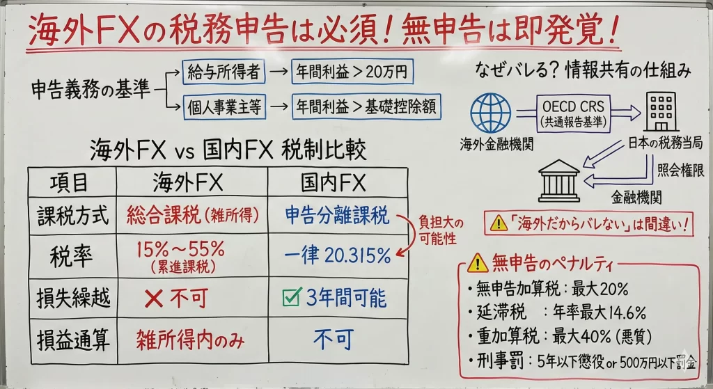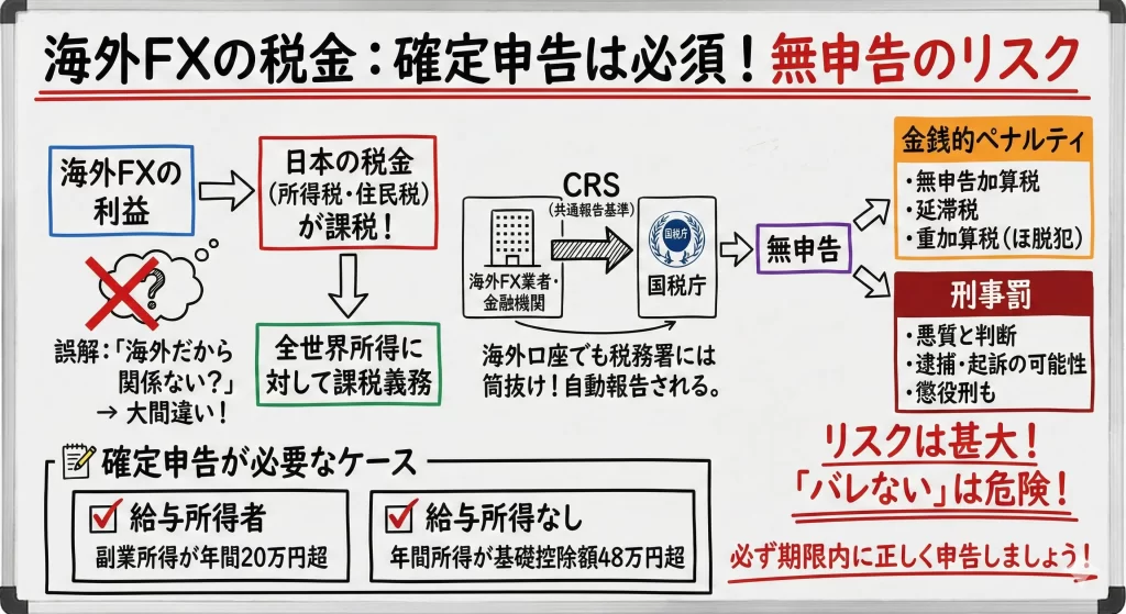 海外FXで得た利益は雑所得として総合課税の対象となり、必ず確定申告が必要です。