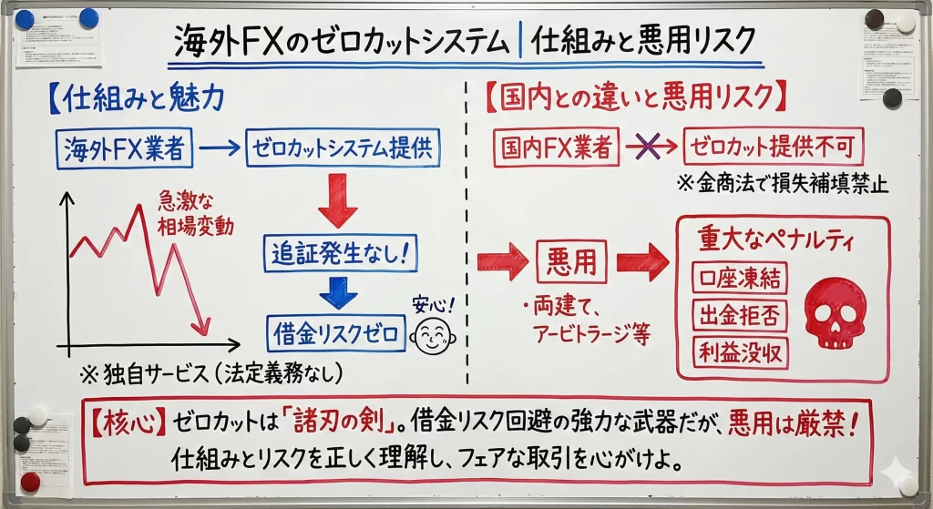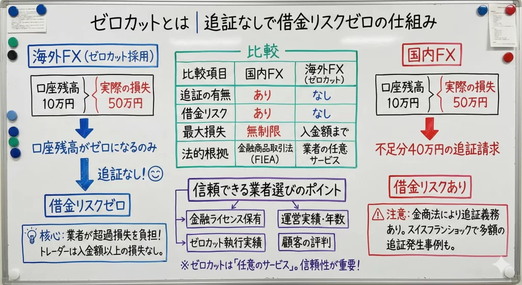 また、相場の急変動時に口座残高を超える損失が発生しても、ゼロカットにより借金を負うリスクがない点も重要なメリットとされています。