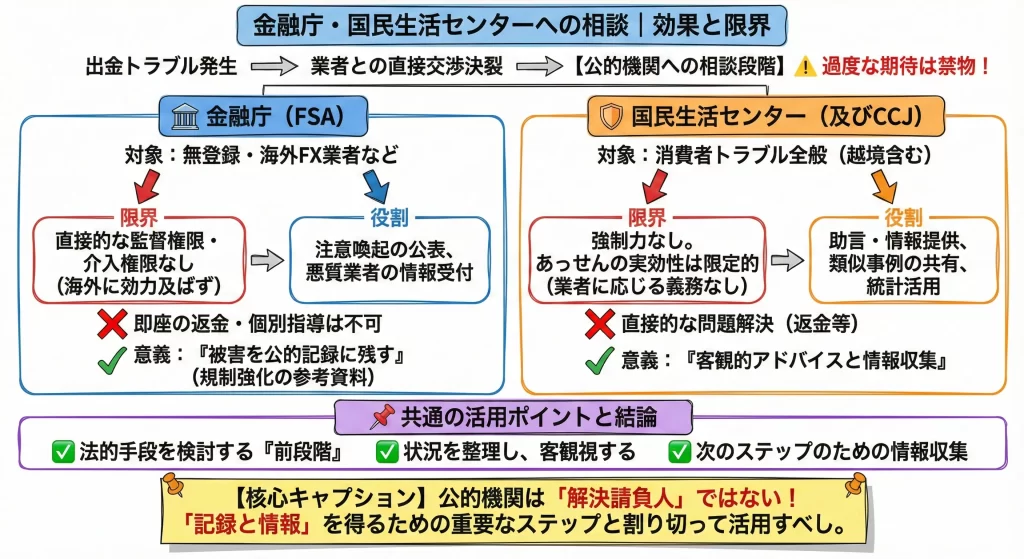 トラブルが発生した場合、金融ADRや国民生活センターへの相談は可能ですが、強制力のある解決手段は限られます。